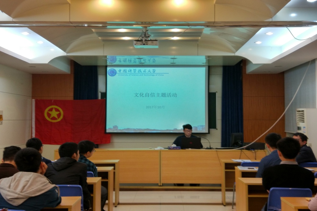 10月10日,在班委刘高正同学的主持下,2017级信息学院6系博士研究生召开“文化自信”主题班会,旨在积极响应团委的号召,使同学们树立正确的世界观、人生观、价值观,树立文化自信,让青春在为党和人民建功立业中焕发出绚丽光彩。