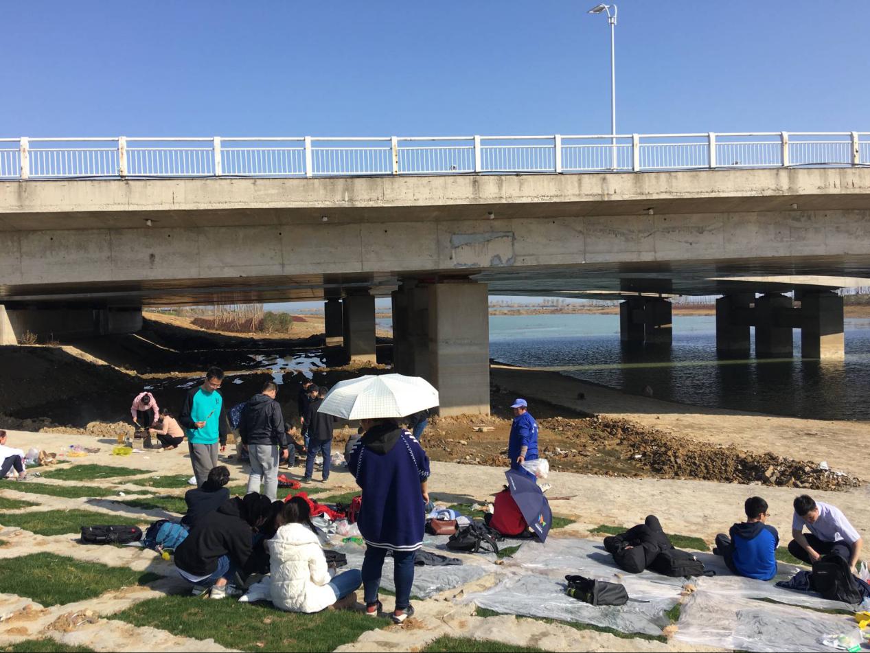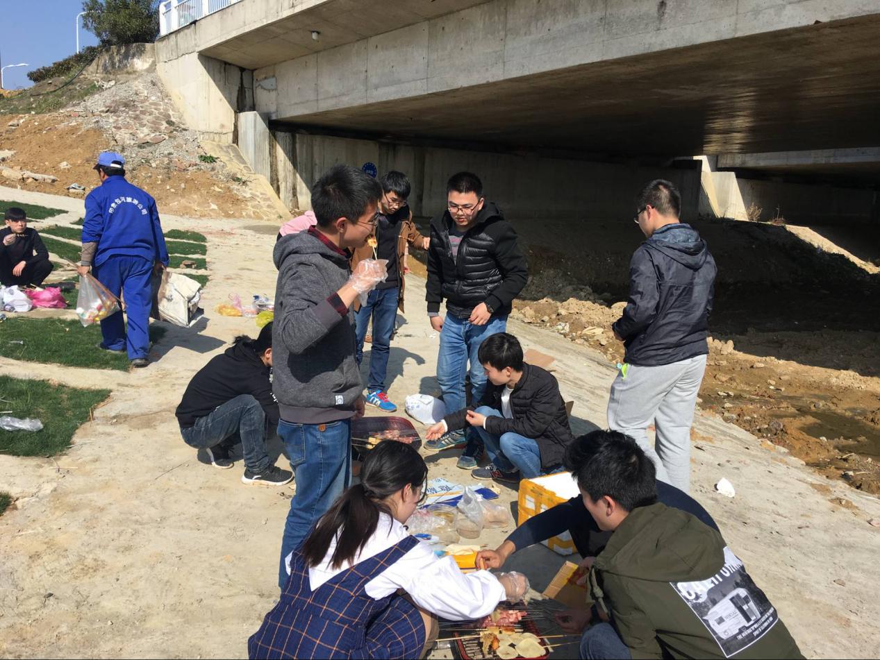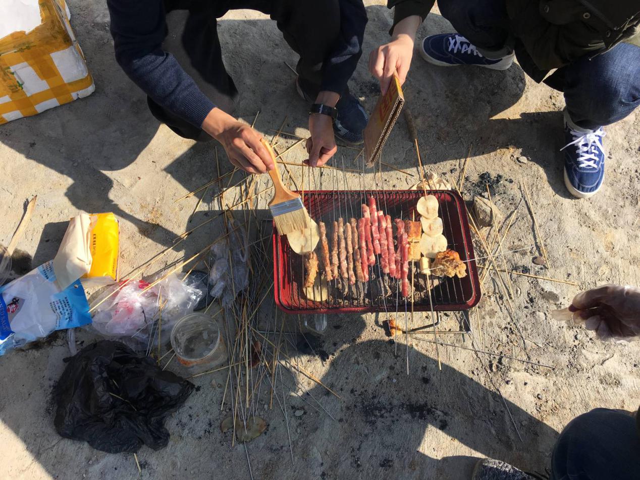 再集合,已是中午时分。双手与双眼都感受过春天的我们,需要让我们的胃也感受春天。大巴沿湖而行,在一片堤岸边停下。同学们从车上搬下早已备好的烤架、炭火与食材,准备在春光中来一次露天烧烤。选定地点后,同学们分工协作,或搭设烤架,或准备食材,或铺设营地。在这些工作中,最艰难的当属点燃炭火了。大家都是新手,操作并不熟练,只能不断摸索尝试。非常幸运,在不远处,有一家人正在烧烤,有的同学便前去取经,并带来了火种。在同学们的不懈努力和那家人的帮助下,炭火终于成功点燃。忙活了许久的同学们迫不及待地将一串串食材放在烤架上。看着食材逐渐变熟,每个人心中都充满了成功的喜悦。热辣的烤串伴着清凉的草莓,属于春天的美味冲击着每个人的味蕾,填饱了大家饥饿的胃。饱餐一顿后,同学们又进行了一些娱乐活动,将春游的气氛推向高潮。
