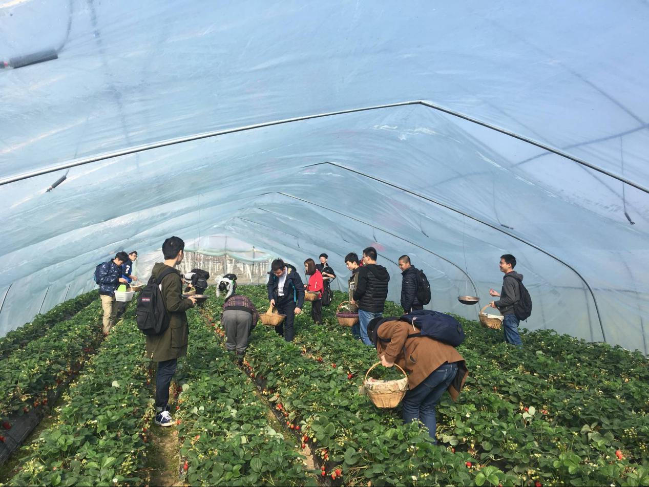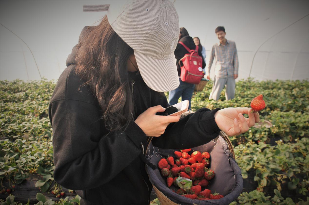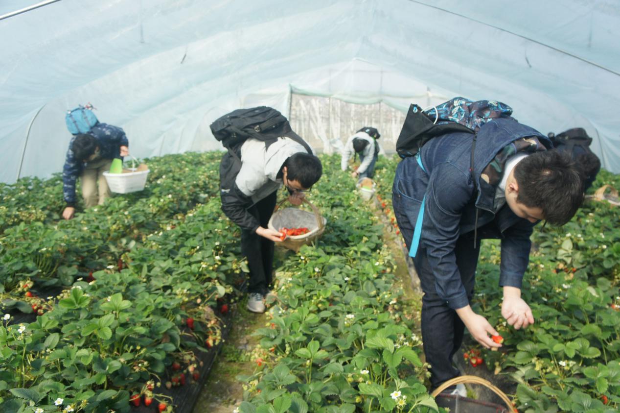 春游的第一站是合肥东南大圩镇的草莓园。同学们一下车,便兴冲冲地前往草莓园。远远望见园主站在门口迎接,同学们不觉加快了脚步。草莓园处在一片种植园中,面积不大,却很精致。几间白色的大棚掩不住里面充满生机的绿。也许是刚浇过水,园中稍显泥泞,但却不能阻挡大家的脚步。同学们拎着篮子,钻进了大棚。只一眼,同学们就被那绿叶中诱人的红深深吸引,纷纷俯下身去,伸手采摘春的果实。一群人散在大棚中,拨开绿叶,精心挑选,将那些又大又圆的草莓放进自己的篮中。草莓园的员工也对我们采摘的手法进行了现场指导。有的同学的额头沁出了汗珠,但手却没有丝毫的放慢。劳动的快乐与收获的喜悦交织,温暖的大棚里充满了快活的空气。