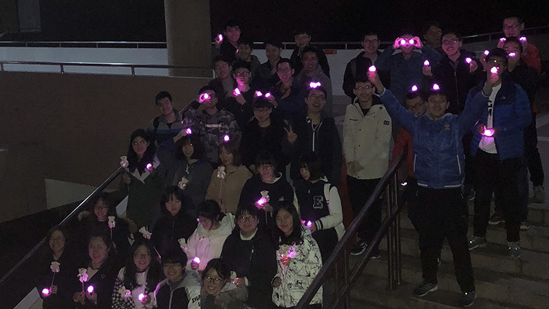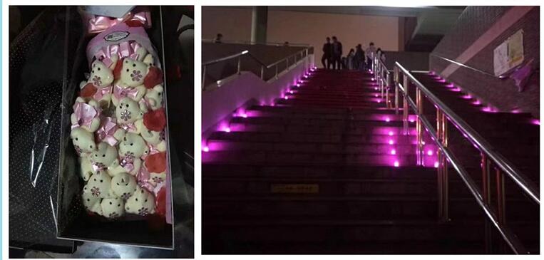 这晚,西区学生活动中心正秘密地策划着一起活动。16级信院一班的男同学们兵分两路,一队在乒乓球室附近等待为女生们献唱一曲;另一队在西活的台阶上精心装扮着烛光红毯。在邀请下,女同学们来到了乒乓球室附近,这时“埋伏”已久的男生们打开手机的闪光灯,一起为女生们献上了小虎队的经典歌曲:《爱》。