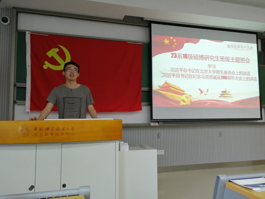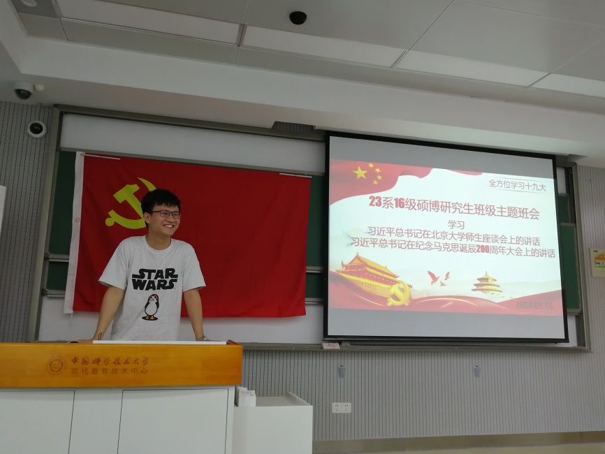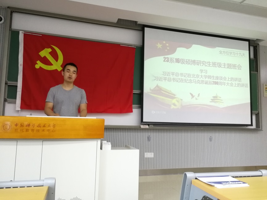 为深入学习贯彻党的十九大会议精神,推进“两学一做”学习教育常态化制度化,学习贯彻习近平新时代中国特色社会主义思想。2018年5月16日,中国科学技术大学信息科学技术学院23系16级硕博士班级召开了第一次主题班会,同时也是硕士支部23系16级硕士支部学习的一次会议。会议主题是“交流学习习近平总书记在北京大学师生座谈会上的讲话和习近平总书记在纪念马克思诞辰200周年大会上的讲话”。