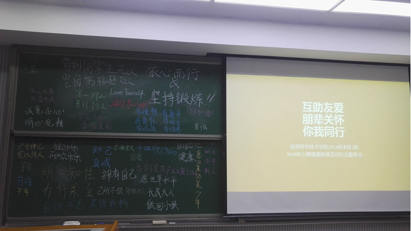 5月9号晚上,我班开展了以“互助友爱,朋辈关怀,你我同行”为主题的心理教育主题班会,虽然正值毕业论文设计的关键时期。班会由心理委员程思凡和刘京松主持。