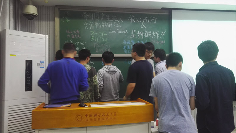 班主任王老师讲话,并号召大家在黑板上写下自己对未来的希冀。