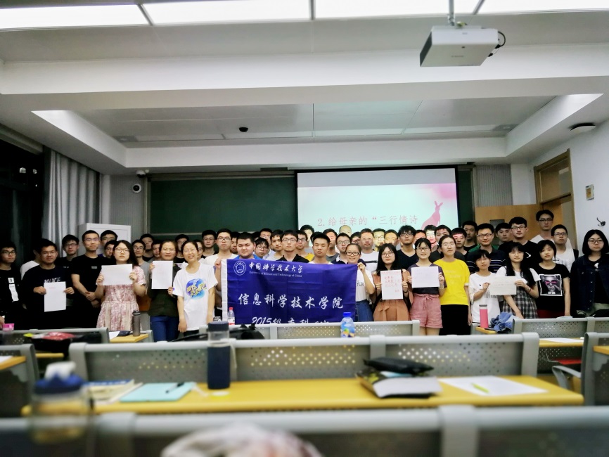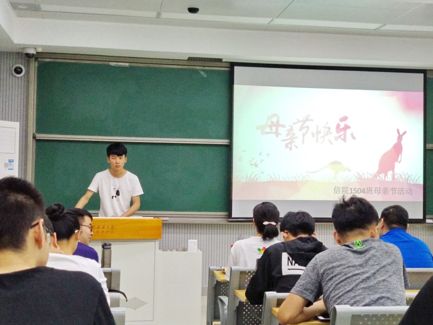 呱呱坠地,是母亲给了我们生命;二十弱冠,是母亲教会了我们处事为人;科大圣地,这里有母亲的功绩。为了表达对远方母亲的感激与思念之情,信息学院1504班班委精心策划和编排,于母亲节当晚7点在3A109教室举办了母亲节专题活动。本次活动由班长薛峰主持,尽管是周日,班主任吴善珍老师一如既往地到场给同学们拍照留念,教室内座无虚席,同学们热情高涨。