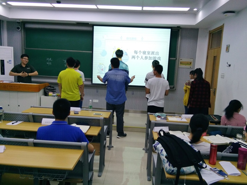 最后进入了本次主题班会最激动人心的环节——游戏环节,大家以寝室为单位,一起玩游戏,第一个游戏是信任游戏,活动的规则很简单:请几组同学上台,一组的两个同学必须是室友,一个同学站在讲台的台阶上并且面向黑板,另一个同学站在他的身后,前面的同学身体向后倒,后面的同学负责接着他,用时最少的的组获胜。这个游戏很能考验信任关系,因为一般的人身体向后倒时都会有自我保护的动作,但是游戏规则要求必须笔直地倒下,但是参加本游戏的同学都在2秒钟完成了任务,真不愧为好室友,同学们一齐为参赛的同学鼓掌。第二个游戏名叫是“公开处刑”:主持人问个问题,比如说“谁最胖”,一个寝室的同学立即相互投票,被投票最多的人谈感受,这个游戏考验了大家是否坦诚相待问题,许多游戏模拟了寝室里面经常出现的现实情景,同学们感同身受,教室里面笑声不断……活动很精彩,奖品也很诱人,优胜寝室都获得了班委们精心挑选的书籍:有人格心理学的书籍、情绪管理的书籍等,优胜队拿着自己收获的书在讲台上合了影。