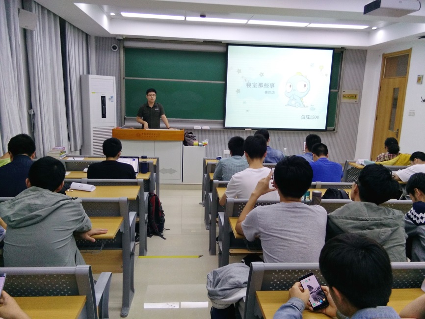做完心理测试之后,秦世杰开始进入本次班会的主题——寝室关系,他先列举了我们寝室中出现的一些囧事,有的都变成漫画或者表情包了,例如“关灯表情包”表明在睡前谁关灯是常见的难题,大家看到这些表情包,不禁想到自己寝室也有类似的难题,许多人不由自主地笑起来。接着秦世杰又给大家看了一集动漫,讲的是女生寝室的日常,动漫中的寝室四人性格迥异,各有优缺点,平时吵吵闹闹,一次吵架决裂后又相互检讨自己的问题,最终和好如初,这是寝室包容的一面,看到这里大家心里暖暖的。