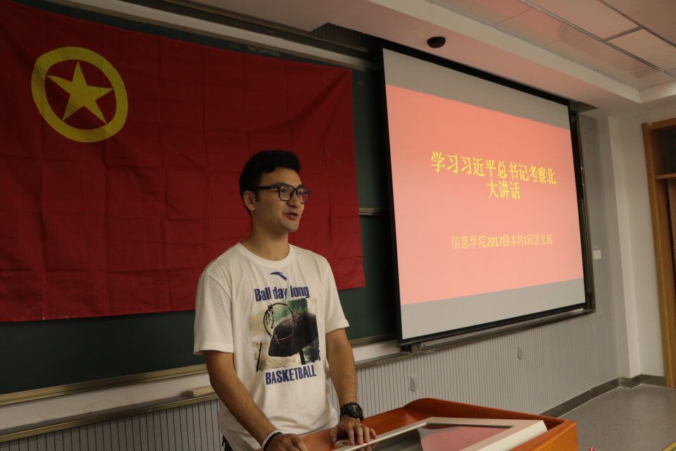 团支部书记卡木然主持会议,以观看讲话视频的形式,带领大家对系列讲话内容进行学习,还向同学们传达了高校思政会议的主要内容。