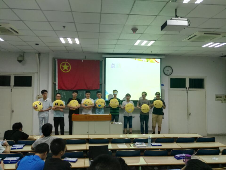 同学们先后进行了知识竞答,击鼓传花,猜数字等游戏。其中,程志华同学带领的第三小组,在知识竞答中获得了第一名的好成绩,每个获得了最终大奖——抱枕。下图为同学们上台领奖。