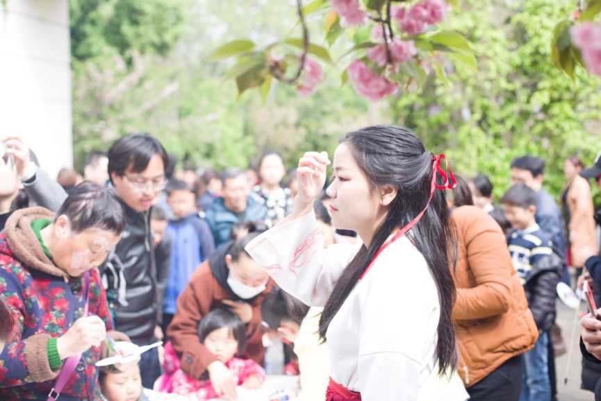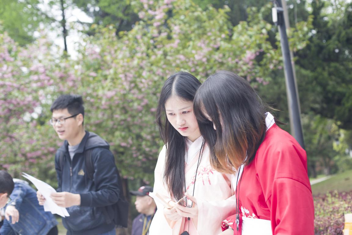当然,各类体现中国传统文化的活动也少不了。“传统文化答题”和“汉服摄影”深受大家的青睐。“传统文化答题”是参与者来回答组织者提前准备的有关中国传统诗词的题,答对即可获印章,同时主持人还会对该题目进行讲解以便参与者能够更深入地了解传统文化。而“汉服摄影”是穿着独具特色的汉服在樱花下拍照,大家都争着报名,以各种姿态展现着汉服、樱花和人交相辉映的魅力和风采,在樱花树下演绎了一场极具传统色彩的文化盛宴和视觉享受。