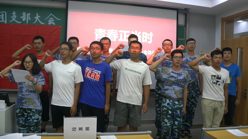 教室前面悬挂着鲜红的团旗,黑板上粉笔板书了班会名称,投影上播出了以全班同学合影为背景的大会主题——“青春正当时“。