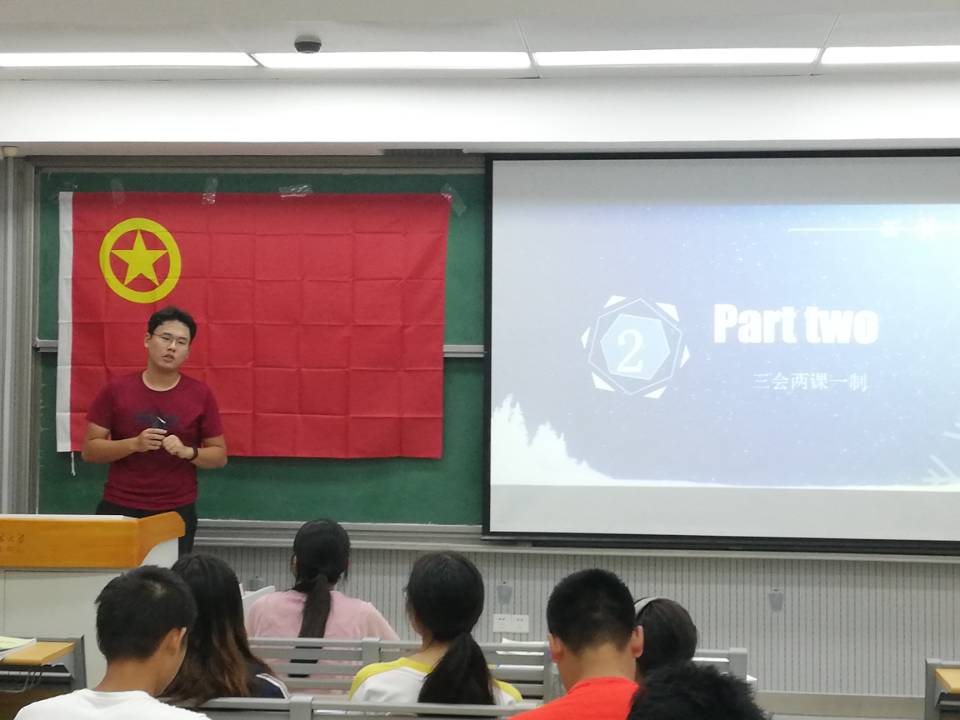 团支书赵鑫首先宣读了关于主题团日申报的有关规定。为了提高班级组织主题团日活动的积极性,每学期每班举办至少一次主题团日活动。活动开始前,要主动向团组织申报活动内容,制定规划方案,明确经费预算;活动结束后,要积极总结,按时按质撰写新闻稿。最后,赵鑫同学强调了团组织的集体性与严肃性,即使在校外活动中,团徽、团旗等缺一不可。