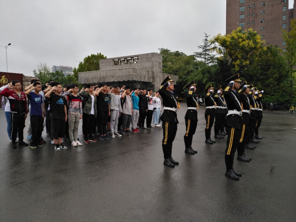 九名升旗手升旗台上就位,十名护旗手也在升旗台下整齐排开,和观礼的同学一起见证这神圣的时刻。随着主持人宣布升国旗奏国歌,鲜艳的国旗在那雄壮的义勇军进行曲中缓缓上升,护旗方阵的同学以军礼和注目礼向国旗表达着敬意,在场师生都在国歌声中庄重地注视着冉冉升起的五星红旗,唱响国歌。