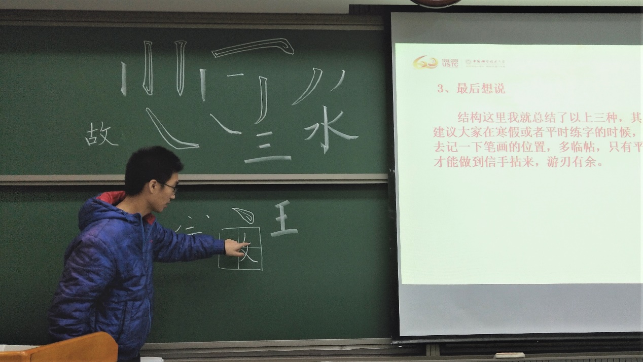 储博涵同学的书法知识讲座紧随其后。众所周知,基本笔画和间架结构是汉字的精髓,储博涵同学就这两方面为同学们做了深刻的阐述。同时他还收集了同学们一些常见的错误,并在黑板上一一纠正、讲解。同学们奇奇怪怪的字体让大家捧腹大笑,储博涵精彩的讲解让大家醍醐灌顶。