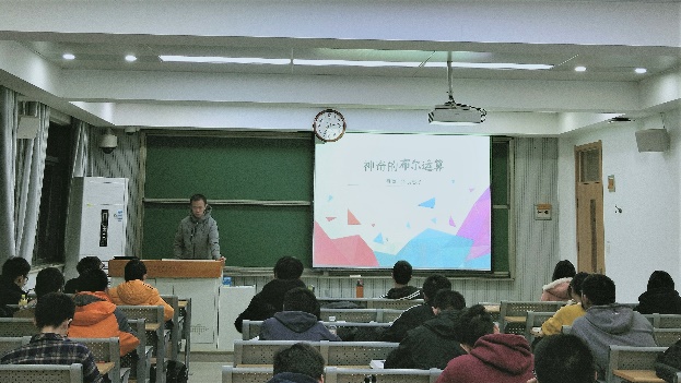 首先进行的是贺志扬同学的“布尔运算”报告。他从布尔运算的简要定义、数学意义和广泛应用三个方面做了简明扼要的介绍。他的描述生动形象,有条有理,使同学们很轻松地理解要点。在报告结束后,他还精心准备了一个小活动,希望每位同学选出自己的年度汉字,并使用简单的布尔运算操作制作成艺术字。同学们都满怀信心,跃跃欲试。