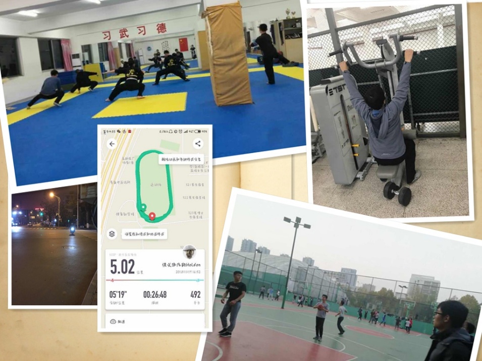 毛泽东在《体育之研究》中这样写道:“体育一道,配德育与智育,而德智皆寄于体。无体是无德智也。”说的是人的全面发展从体育运动开始。时光荏苒,大二上学期就要过去。然而,大学生活不能只有学习,还应有运动激发生命的活力。为加强体育锻炼,激发同学们的运动兴趣,在紧张备战期末考试的同时增强同学们的身体素质,经过筹备,1703班组织开展了冬季体育打卡活动.活动开始于2018年11月19日,为期六周,活动进行的过程中,同学们踊跃参与,许多平时不爱运动的同学们都走出了教室走向了操场。其中打卡的运动种类五花八门,包括跑步(操场跑/公路跑)、足球、篮球、乒乓球、羽毛球、网球、手球、排球、健身(宿舍/健身房)、武术等等项目。