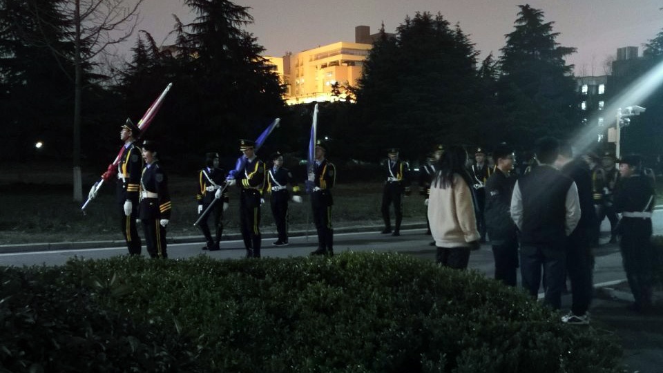 周六晚七点半,大家准时在国旗下集合,划分为升旗、护旗两个方阵开始训练。训练内容主要是军训时学习过的齐步、正步等内容。由于刚刚下过雨不久,气温还很低,可训练的同学们和作训的教官似乎完全感觉不到寒冷,精神面貌十分昂扬。傍晚的训练一直持续到十点半,三个小时的高强度训练十分辛苦,每个人都感觉到腰酸腿痛,但每个人都默默地坚持训练,努力地走好每一步。