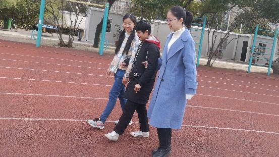 当天下午三点,志愿者一行来到了视障部给孩子们送去温暖。在操场上,志愿者们一人带领着一个小朋友散步,和他们聊天,帮助小朋友们解决情感上的困难。志愿者们也去参观了小朋友们的教室,和他们一起唱歌、做游戏,在欢快的音乐中,孩子们露出了灿烂的笑容。