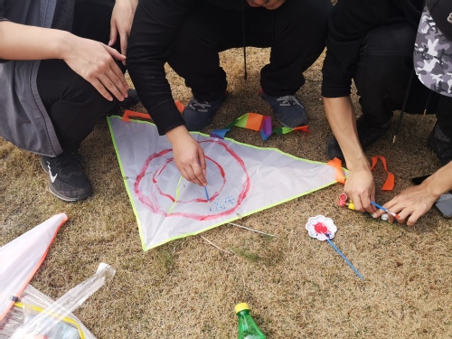 在游览完植物园后,班级同学回到开阔草坪上的营地。清风微拂,天空中摇曳着几只风筝。班委将准备好的纯色风筝和水彩摆出,提供各小组发挥创意制作独特的风筝的机会。随后,同学们带着风筝来到草坪上,探风、奔跑、放线、拉线,将风筝和青春的热情一齐放飞于蓝天之上。