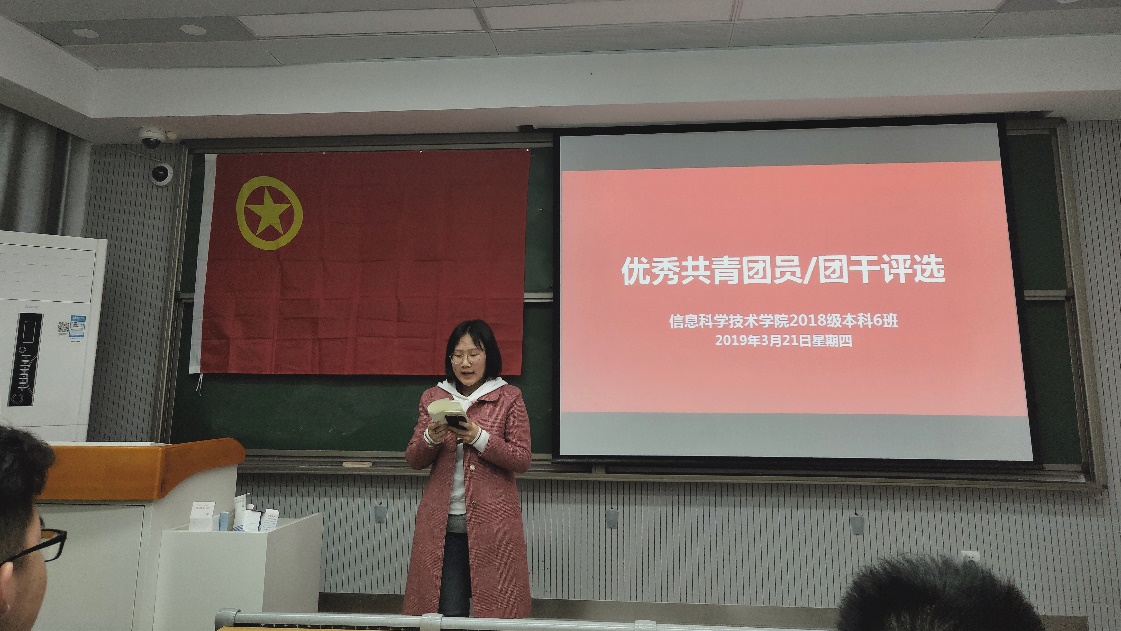 2019年3月21日(周四)晚20:00,信息科学技术学院1806班在3A412教室召开了“优秀共青团员/团干评选”主题班会。1806班全体同学及班主任王百宗老师出席。
