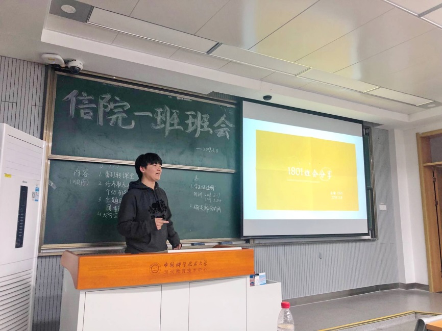 晚上7点整,信院1801班同学们齐齐坐在教室里等待着主题团日的开始。团支书赵明坤同学首先向我们介绍了此次主题团日的内容,并向大家介绍了1801班的党员培养联系人与学业小导师高楠学长,同学们对高楠学长的到来表示热烈的欢迎。