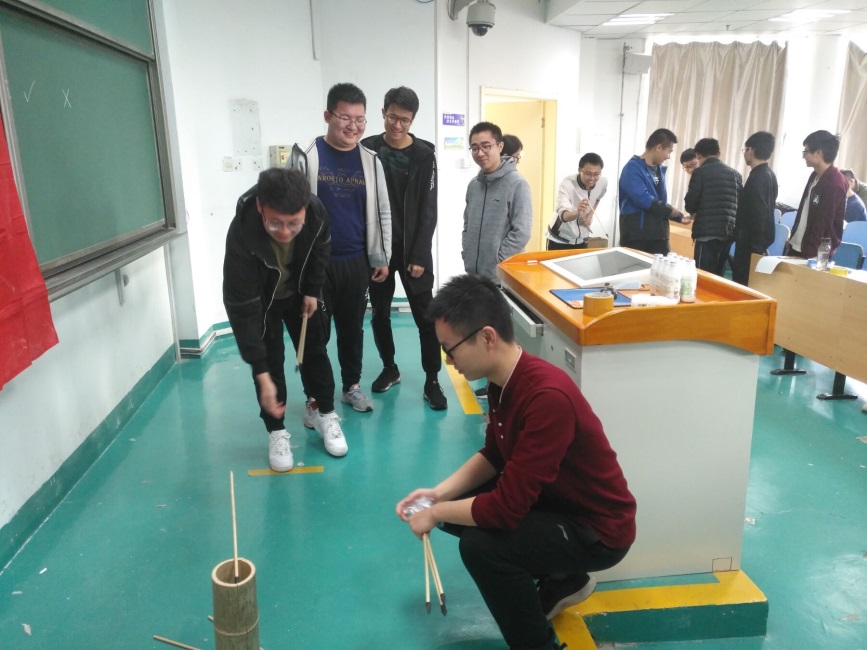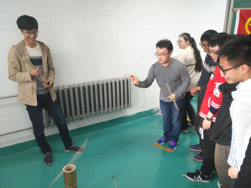 韩世昌同学为大家介绍了“投壶”这一具有历史气息的中国古代的娱乐项目。他认为“投壶”是古代有学问的人喜好的活动,在当今看来,它更象征了在扎实求学的历程中德才双修,德才兼备的一种体现,希望由此体会到在慢慢求索路上既要刻苦求学,又要以德修身。同学们纷纷离开座位参与到游戏中,气氛十分热烈。