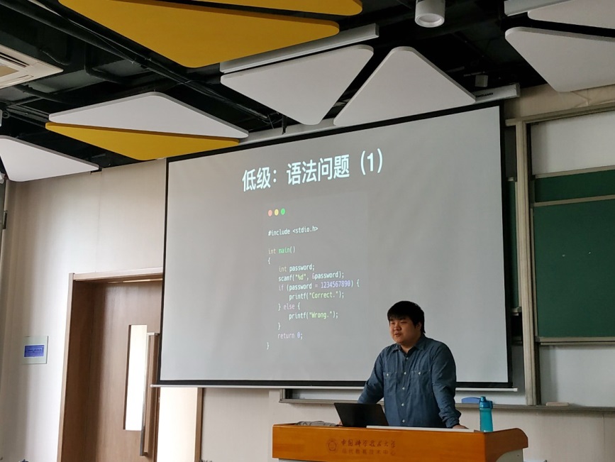 下午两点整,在中国科学技术大学西校区3C教学楼102教室,讲座准时开始。首先何纪言学长为大家举例说明了在编写程序中Bug带来的危害与损失,以及学会Debug的重要性。之后,何纪言同学举出了几个在同学们编写程序中常见的Bug作为例子,以及表示会在后面介绍如何解决这些Bug。