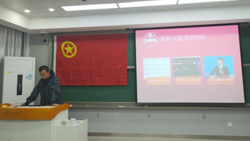结合班级团学活动特色主题项目,本次开展的“每周一会”的主题是“996工作制度”。贺志扬同学向大家讲述了“996”的由来及其饱受的争议,同学们听完讲解后增长了知识,对当下的时事热点有了进一步的了解与关注。