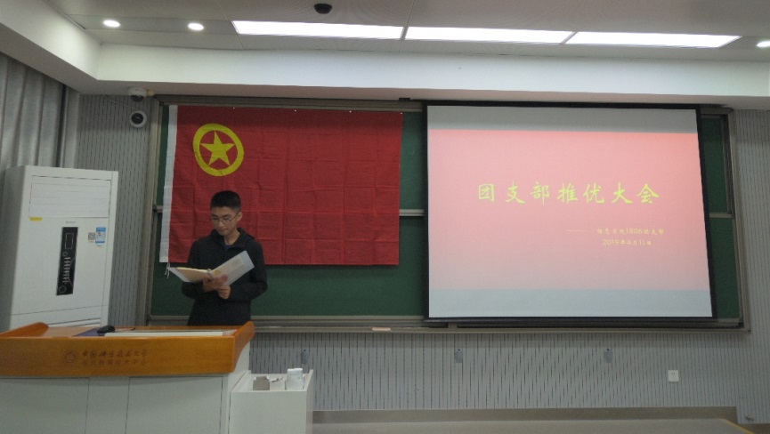 2019年4月11日晚,信息科学技术学院1806班团支部在3A412教室召开了全体团员团支部大会。本次会议的主要议程是根据推优入党的流程推选出班级符合条件的提交了入党申请书的团员同学作为入党积极分子人选。大会由班级团支部副书记储博涵同学主持,班级全体团员出席大会。