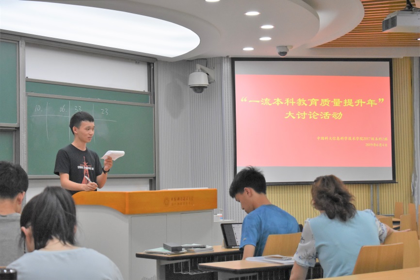 2019年6月4日晚19时许,信息学院17级本科2班于3A213教室召开班会,由2班团支书徐诚超同学主持。会上,徐诚超组织同学们就“一流本科教育质量提升年”的几个问题展开讨论。
