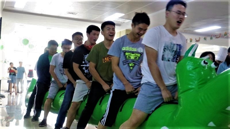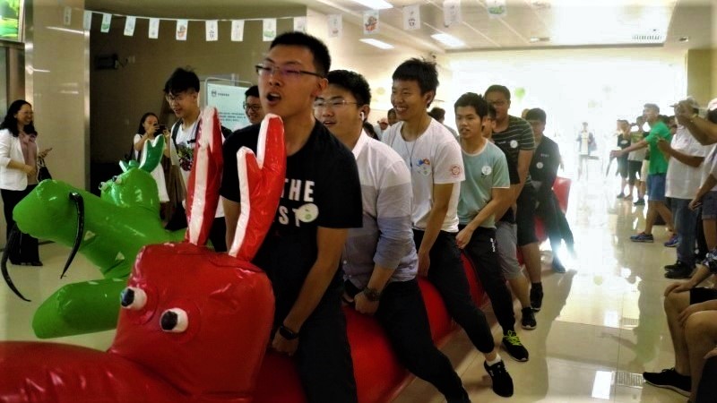 在活动开幕式上,领导向我们阐释了端午节的文化意义,开幕式结束后,工作人员给参加活动的同学们分了两米长的大蛋糕。然后1803班的两支代表队参加了旱地龙舟的比赛,八位队员在队长响亮的口号下,迈着有节奏的步伐,一起抬着龙舟,向前冲刺,大家合作竞争很有干劲。