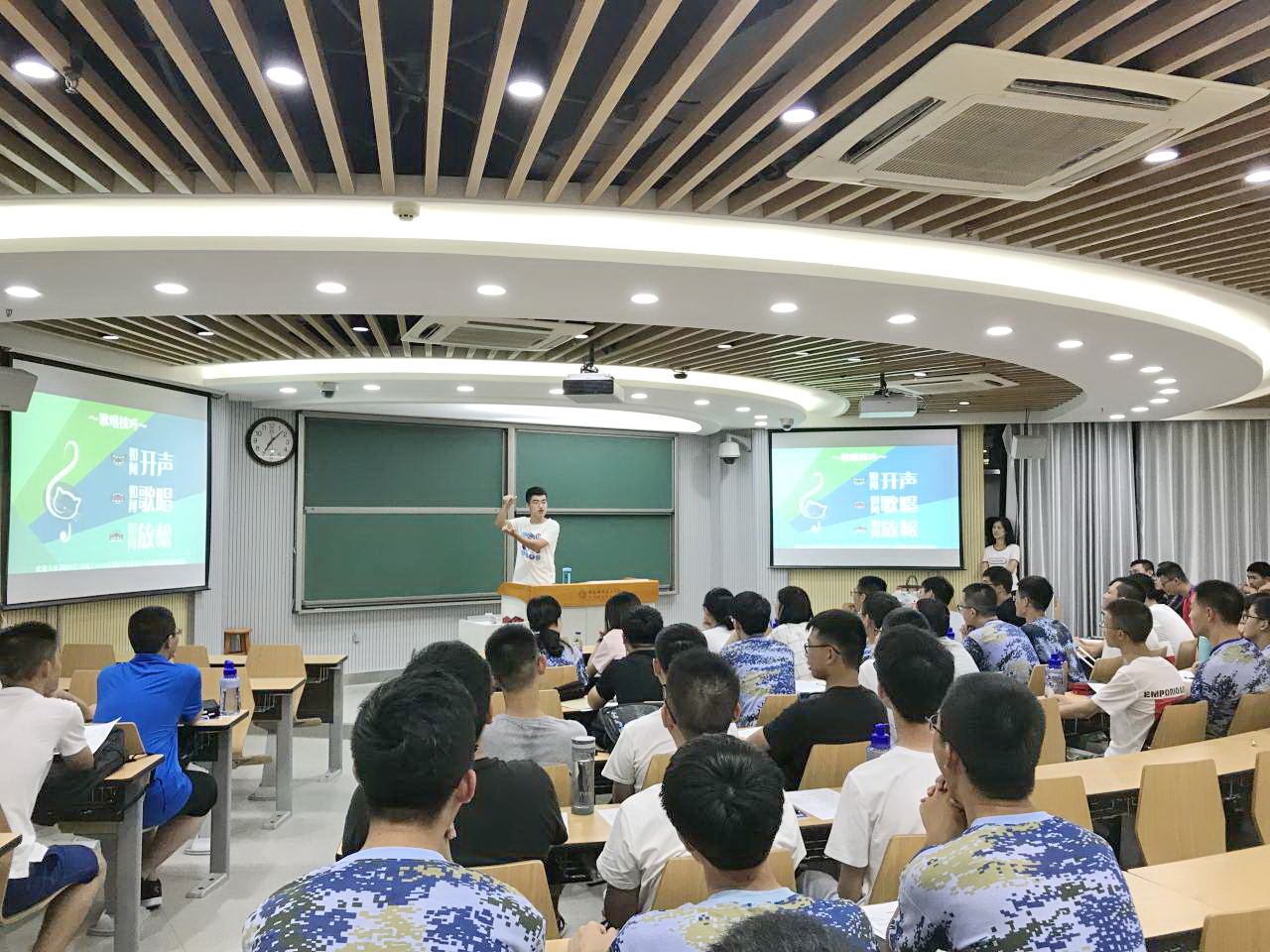 合唱队的商名杰学长介绍了校歌深厚的意蕴和辉煌的历史,同学们都对此感到十分自豪。随后,同学们一句一句地学唱校歌,尽管练习时间短暂,但是同学们都能够熟练演唱校歌了,学长也给予了高度的评价。