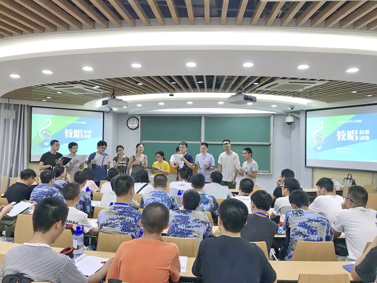 2019年8月26日晚,信息学院本科19级5班和6班共同接受了新生教育,在5班班主任周燚老师和6班班主任阳思老师的共同主持下,由校合唱团指导,学习演唱中国科大校歌《永恒的东风》。