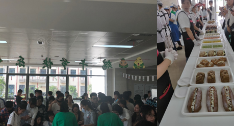 端午活动的形式丰富多样,现场有游戏互动、知识问答、大餐品尝等项目。食堂特意制作了两米长的大蛋糕供同学们品尝,还有各种各样的美食,如面包、天津汽锅鸡、京酱肉丝、蒸饺、羊排、回锅肉等,均为免费品尝。还有与端午相关的知识问答项目,编制香囊活动,均可获得相应的礼品。