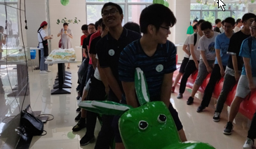 还有最为激烈的比赛性质的“陆地赛龙舟”活动。比赛两队在“龙舟”上坐成一列,待比赛开始后一起提着“龙舟”向前奔跑,先达到终点者获胜。同学们玩得不亦乐乎,不少人甚至参加了两次这个比赛。