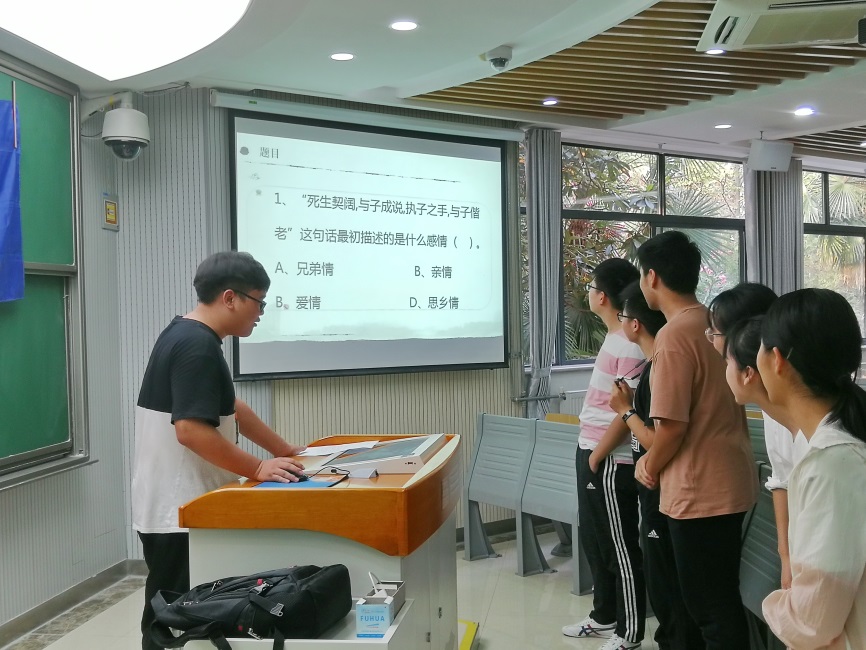 9月25日下午,刚刚在东、西校区下课的同学们便快马加鞭地赶了过来,一起欢聚在西区科技实验楼2楼会议室。同学们每个人的手中都收到了一张带有编号并写有一句谜语的纸条,根据纸条上的编号,同学们很快分好了组。不过纸条上的谜语让不少同学头疼,比如“忠心尽献”、“总是玉关情”、“得胜不见月光明”、“明月一去无踪影”、“口诀无言用心算”、“休把旁人抬太高”等,而且一个小组里每个人的谜语还不尽相同,这些蒙着面纱的神秘谜语引起了同学们热烈的讨论。