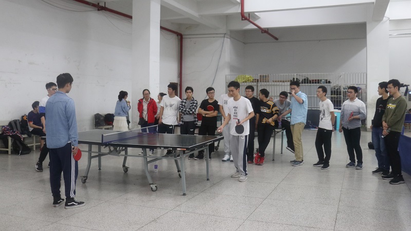 2019年11月3日下午, 在平常周日下午略显冷清的西区活动中心的乒乓球桌旁却围满了信院本科1803班的同学,大家的视线都集中在那一颗上下翻飞的金黄色的小球上。一声接一声的惊叹,一次又一次的呐喊,使得一阵高过一阵的赛事气氛在整个活动室里弥漫。经过男生六个小组赛的激烈角逐,林笑、吴皓晨两位同学取得了决赛权。此刻,他们正分立在乒乓桌的两侧,一招一式间,决定着这场班级乒乓球赛的冠军归属。吊角球、惊险擦边球、近乎诡异的旋转式发球…… 球逢对手,旗鼓相当,一转眼,五局三胜赛制下的比分已追平至二比二。观者屏息,球手的神经也无不紧绷,这是一场意志上的激烈交锋。