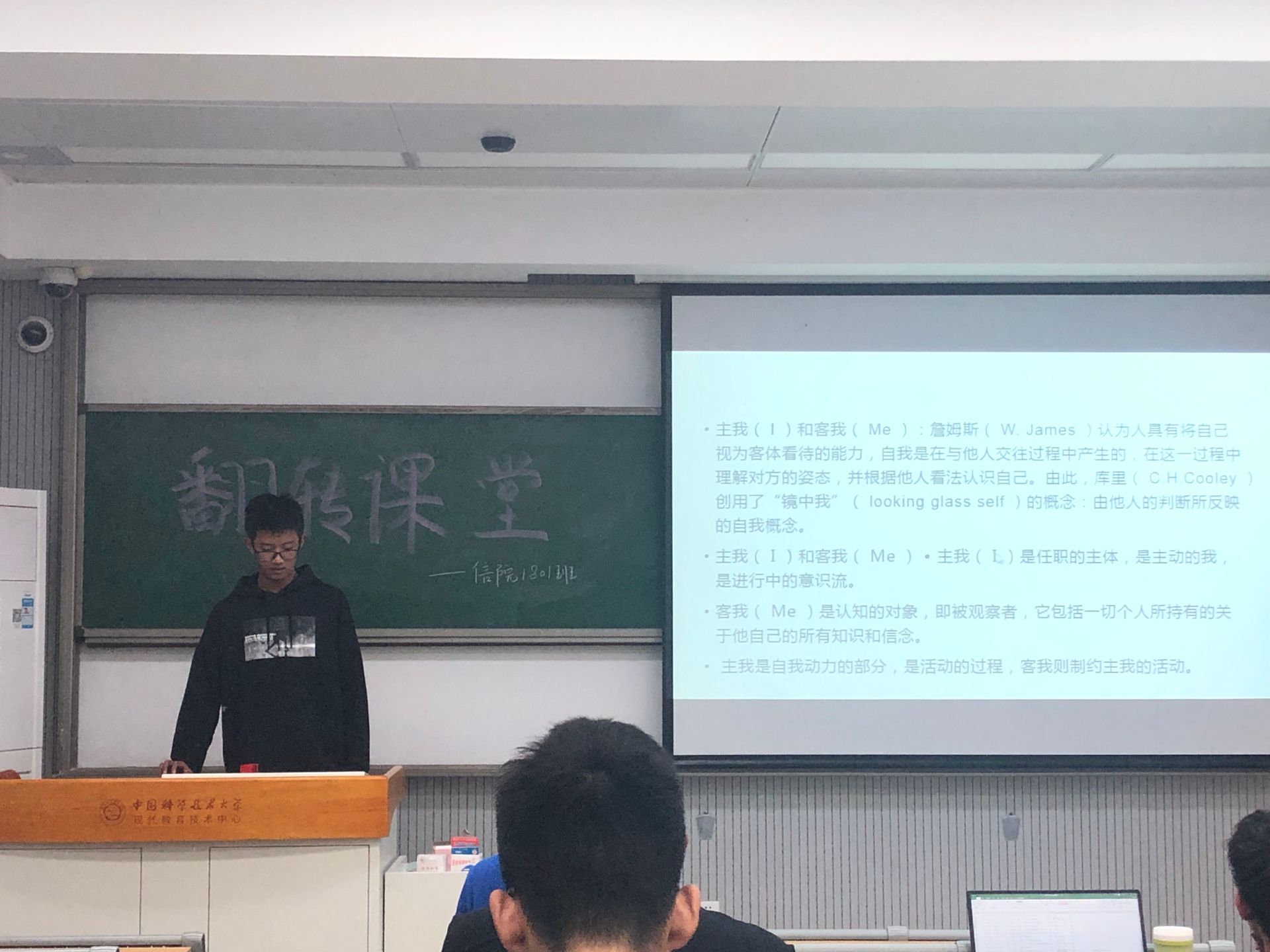 11月11日晚,岳晓凡同学为信息科学技术学院本科18级1班同学带来了主题为“自我意识”的翻转课堂展示。班主任夏老师参加了此次活动。
