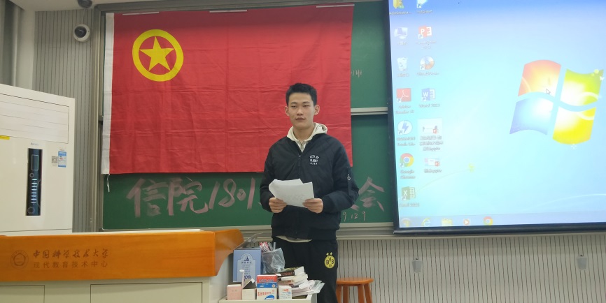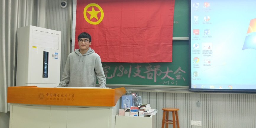2019年12月9日晚,中国科学技术大学信息科学技术学院1801班在3A110召开推优入党大会,本次大会由1801班团支部副书记曹济琛主持。在大会上,入党积极分子候选人赵天翔同学就自己对于党组织的认识和时政的理解进行了发言,并由在场的同学投票表决是否推荐他成为入党积极分子,班主任夏雨婷老师出席了本次会议。