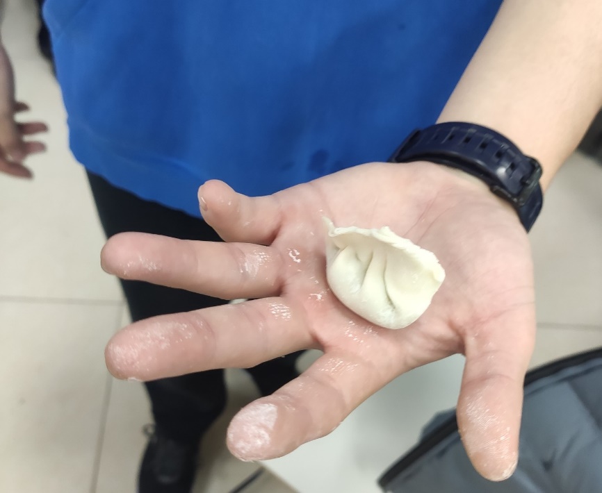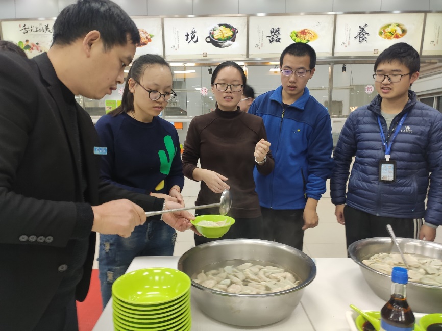 食堂的工作人员提前为同学们准备好了饺子馅料和饺子皮。同学们首先在食堂工作人员的指导下简单学习了如何包饺子。之后同学们和食堂部分工作人员一起包饺子。饺子制作完成后,食堂的工作人员们为同学们将饺子煮熟,同学们在一起品尝自己亲手制作的饺子。吃着自己做的饺子,同学们都露出来开心的笑容。最后同学们和食堂工作人员一起合影留念。