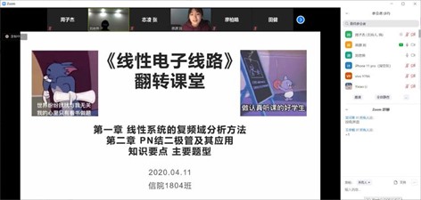 4月11、12日晚,信院本科1804班班长周子杰主持开展了线上翻转课堂,郝泽宇、廖柏皓、刘思源、王俊杰、郭宗颖和徐家航面向全班同学授课。