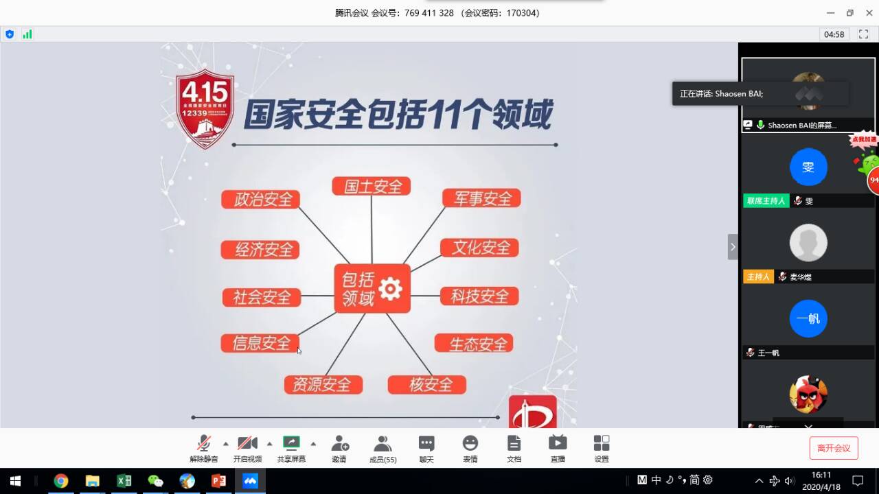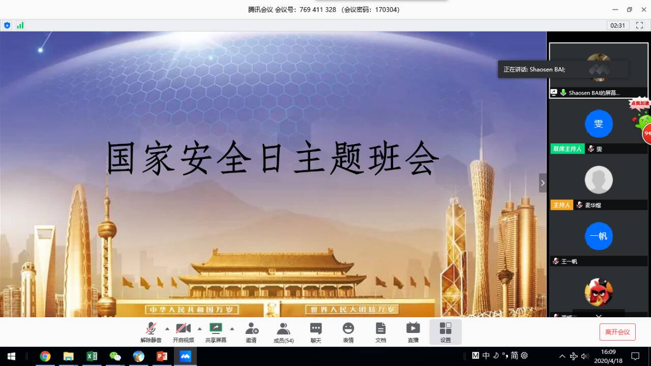 2020年4月15日是第五个国家安全教育日,为了给同学们普及国家安全知识,增强国家安全意识,深入贯彻“坚持总体国家安全观,统筹传统安全和非传统安全,为决胜全面建成小康社会提供坚强保障”的主题 ,4月18日下午,信息科学技术学院本科17级3班通过腾讯会议在线上举行了国家安全日主题班会,班主任陈金雯出席了此次会议,主持人白少森同学。