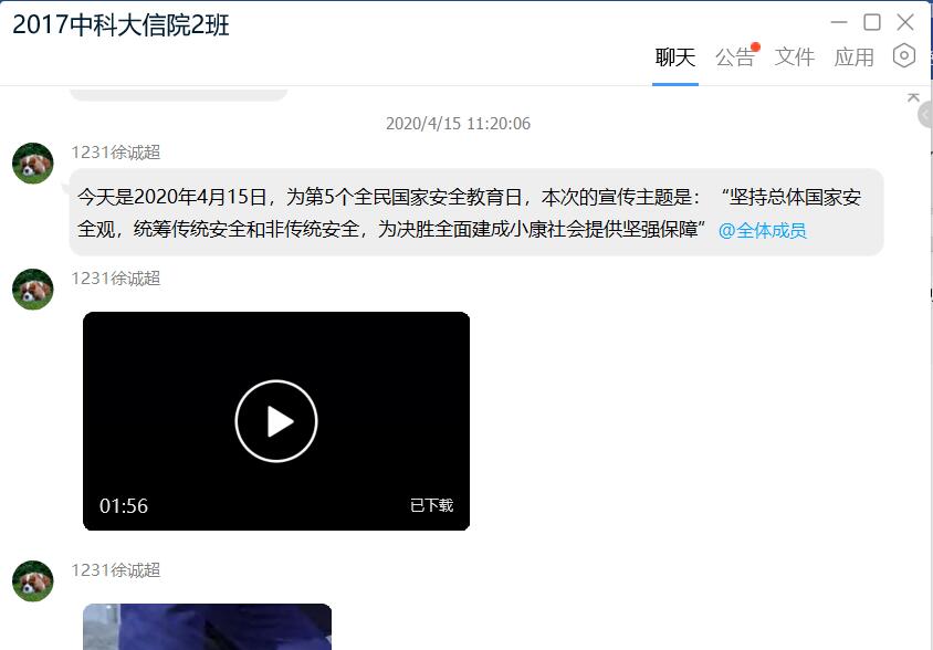 首先,团支书徐诚超同学在班群里发了四个有关国家安全的宣传视频。其中一则宣传视频则用图片与文字结合,形象的告诉同学们国家安全的组成。另外三个视频则围绕着国家安全这一主题,上演了三个故事,风趣地告诉同学们“国家安全,人人有责”,“犯国家安全,绝不姑息”的坚定理念,也让“12339”这条热线深入人心。