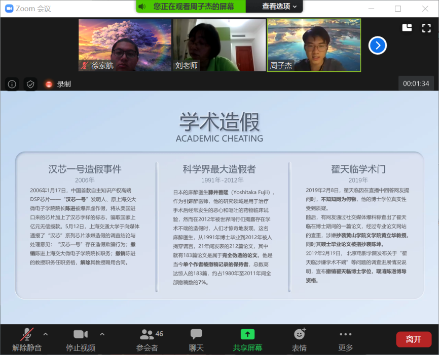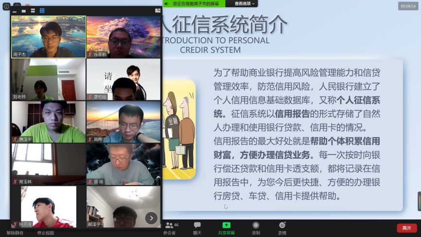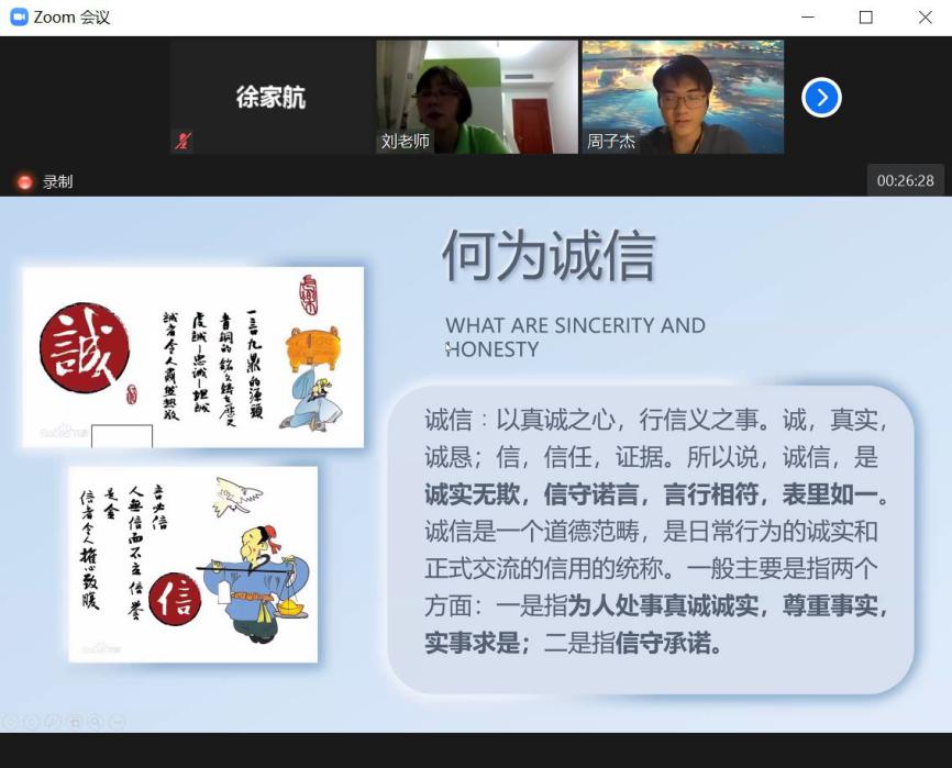 为了响应加强诚信教育的号召,向同学们普及诚信、征信方面的知识,信息科学技术学院本科18级4班于5月29日晚使用zoom在线上举办了以诚信教育为主题的班会,班会由班长周子杰同学主持并讲授,班主任刘桂英老师及全体同学出席了班会。