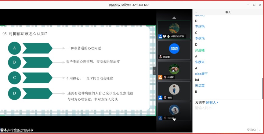 活动以互动环节收尾。卢梓豪向同学们提出了5个问题,同学们积极回复作答后,他再给出正确答案与解释。有的问题简单,诸如“如果在家感到焦虑,应该如何调节情绪”、“如何制定合理的学习计划”等,同学们快速、统一的给出答案;也有的问题有专业性,诸如“对抑郁症该怎么认知”等,同学们回答不一,在卢梓豪同学的解释之下,同学们对这些问题有了更深刻的认识。