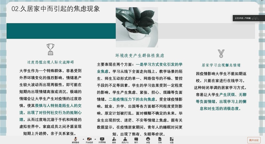 卢梓豪同学首先从疫情期间的心理问题的表现说起。他将这些问题划分为害怕疫情而引起的心里紧张、久居家中而引起的焦虑现象,并具体地分析了这些心理问题的成因。诸如,大学生这个群体易受环境变换的影响产生较大心理波动,而长久居家的环境就有可能导致同学们产生交流障碍问题。