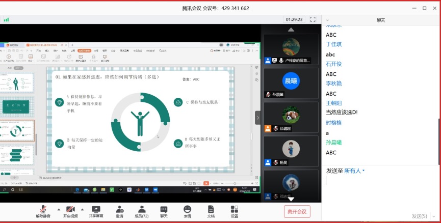 为积极响应我校“聚力同心,战疫同行”心理健康月主题活动,提升同学们的心理健康素质,坚定战胜疫情的信念,2020年5月20日,信息学院本科17级2班组织线上班会,开展线上心理健康知识科普活动。活动中,心理委员卢梓豪用悉心准备的幻灯片,为同学们娓娓道来疫情后常见的心理问题、如何进行心理调节、心理健康的重要意义等三个方面,最后,进行提问互动环节,为这次的心理健康月活动画下完美的句号。