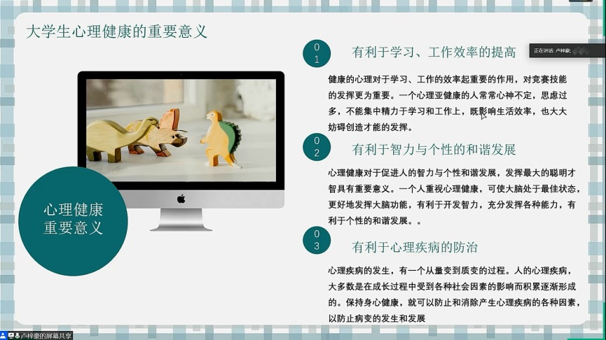 随后,卢梓豪介绍了心理健康的重要意义以及心理健康的标准。心理健康对于我们的生活、学习、工作、成长发展等都有着积极的促进作用,卢梓豪嘱咐同学们关注自己的心理健康,及时调节心情,认知自我,以预防心理疾病的发生和发展。