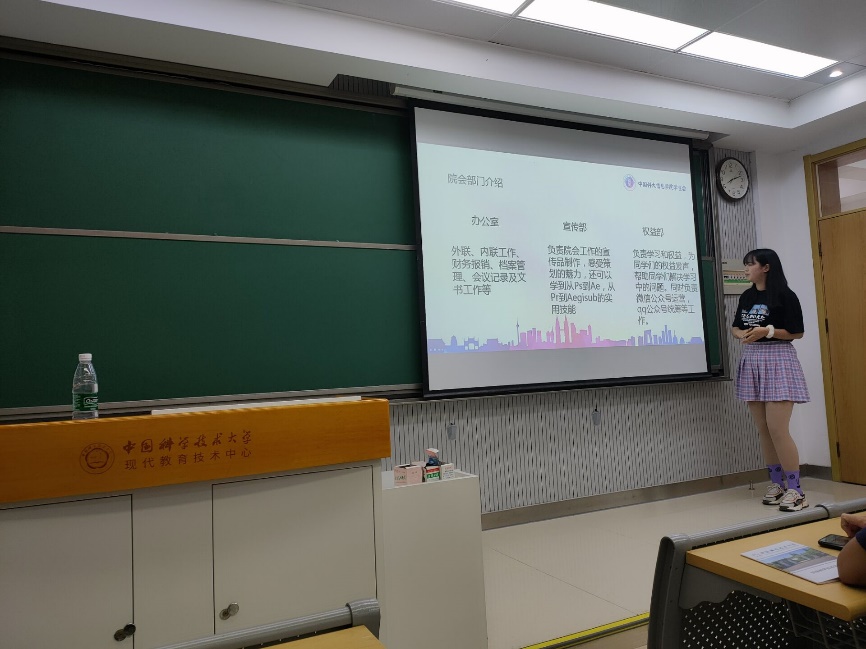 信院学生会主席向凡学姐分享了对于科大学习生活的普及与个人经验,为大家简要介绍了信院学生会的主要部门与各部门的职能,及近年来由信院学生会组织的活动情况。