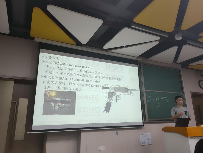 在随后的专业讲解中,王适源学长分析了军事爱好者与WARGAME在国内外的发展情况,以及道具枪械的工作原理和国家相关法律法规,全面增长了同学们的见闻;尤其对于制式枪械、仿真枪械、软硬气枪及激光道具的准确分类的讲解,提高了同学们对于枪械管控必要性的认同。在宣讲最后,战团新旧两位团长向全体在场同学发出了诚挚而热情的邀请,并分享了战团未来的发展规划。
