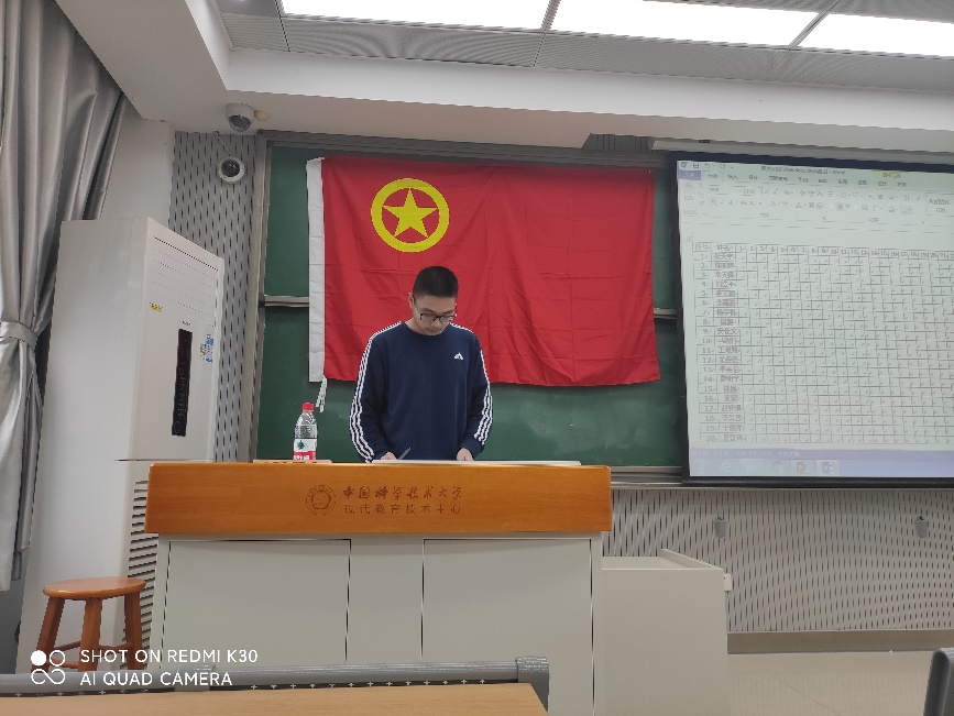 最后,由张天宇同学主持了团员评议活动,到场每位团员在表格中为全班同学打分,得分最高的9位同学将得到评选优秀团员、优秀团干的资格。张老师说到:“这次没有得到资格的同学也不要气馁,每年三月份都会有评议活动,大多数同学都可以得到优秀团员资格,希望同学们能够公正评价”。所有同学都完成表格并交送到张天宇同学手中之后,本次的团员评议活动结束,评议结果将在统计之后公布到QQ群中。